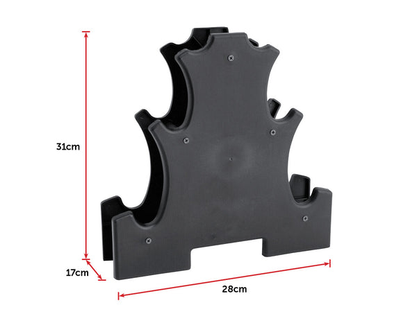 You'll receive 3 sets of colour-coded weights: 2 x 0.5kg weights (blue), 2 x 1kg weights (purple), and 2 x 1.5kg weights (red). The weights are made with a durable PVC material that's tough enough to withstand your intense workout sessions. Your purchase is complete with a convenient pyramidal rack which neatly stores all your weights.